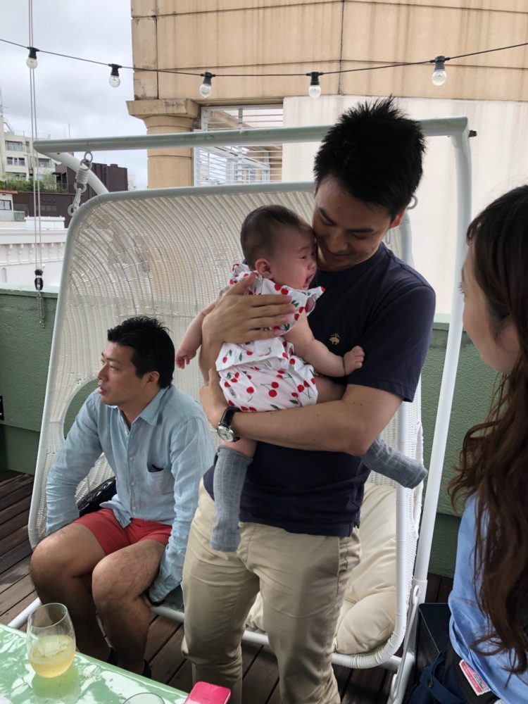 たくさん知らない人がいて緊張気味のお子様を代表がしっかりと抱きしめる様子